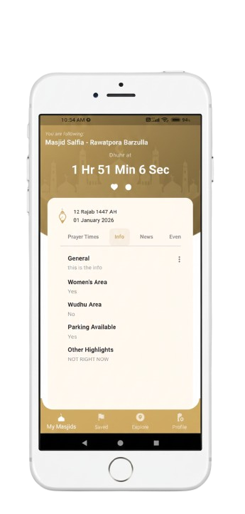 The Noorat app helps individuals stay informed about nearby mosques, prayer times, announcements, and community events relevant to their location.